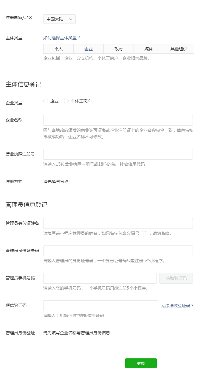 商家根据自己的主体类型,完善主体信息和管理员信息。小程序仅开放给主体类型为公司的商家,暂不开放给个人。企业类型帐号可选择两种主体验证方式。